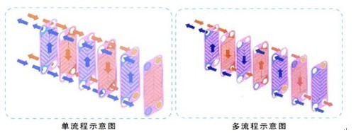 板式換熱器是由高效傳熱板片、密封膠墊、加緊螺栓及框架等主要部件組成。板片四個(gè)角開有角孔,鑲貼有密封膠墊的板片安裝在固定加緊板和活動(dòng)加緊板之間的框架上,用加緊螺栓加緊,密封膠墊按人為設(shè)計(jì)的流程形式將各傳熱板片密封聯(lián)接,形成迷宮式的介質(zhì)流道,兩種換熱介質(zhì)在相鄰的流道內(nèi)互相逆流,形成充分的熱交換。傳熱板片用優(yōu)質(zhì)耐腐蝕金屬薄板壓制而成,波紋為人字型,相鄰板片具有反方向的人字型溝槽,溝槽的交叉點(diǎn)相互支撐形成接觸點(diǎn),介質(zhì)流動(dòng)時(shí)形成湍流狀態(tài),獲得很高的傳熱效率。