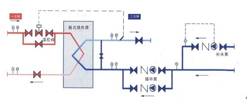 二次回水通過(guò)除污器后經(jīng)循環(huán)泵進(jìn)入板式換熱器,被蒸汽或一次高溫水加熱,蒸汽或一次高溫水進(jìn)入板式換熱器后,變成冷凝水回?zé)嵩刺?,形成二個(gè)獨(dú)立系統(tǒng),進(jìn)行間接換熱,補(bǔ)水泵將軟化水打入二次系統(tǒng)中維持壓力穩(wěn)定。